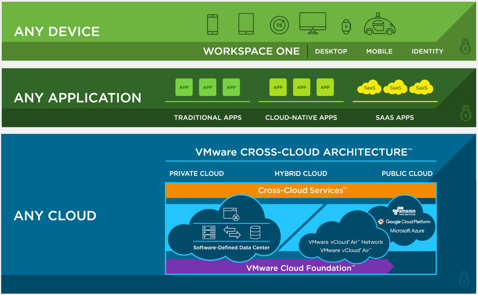 VMware Cross-Cloud is a common OS for hybrid cloud. Stand up workloads in your data center or in the public cloud. Cross-Cloud takes care of the rest.